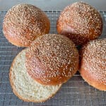 Als alles goed is gegaan, zie de hamburgerbroodjes in de oven flink omhoogkomen. Haal de broodjes uit de oven, leeg ze op een rooster en dek ze daarna af met een theedoek. Zo blijven ze lekker zacht. Laat de brioche hamburgerbroodjes minstens een half uur afkoelen voor je ze opensnijdt. Je kunt de broodjes nu direct gebruiken of invriezen voor later.