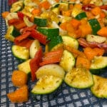 Spreid de groenten dan in een enkele laag uit op een (geperforeerde) bakplaat. Hou wat ruimte tussen de stukken, zodat de lucht er tussendoor kan. Bak de groenten 20m op 180C, schep ze even om en bak ze nog eens 5 minuten. De groente is klaar als hij mooie gegrilde randjes heeft. Controleer of de groente gaar is en zacht aanvoelt als je erin prikt met een vork.