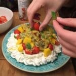 Was de mengkom, garde en spatel goed af om het rauwe eiwit te verwijderen. Klop dan de slagroom met de poedersuiker en vanillesuiker stijf in de mixer. Spatel de slagroom in de pavlova en leg daarop dan het verse fruit. Verdeel als laatste het vruchtvlees uit een passievrucht over het fruit. Eventueel kun je nog garneren met een paar muntblaadjes.