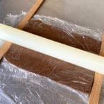 Haal het speculaasdeeg weer uit de koelkast. Dat is, als het goed is, ongeveer 435g. Verdeel het in twee gelijke delen en maak er net als de spijs plakken van. Deze plakken worden half zo dun als de spijsvulling, maar later bij het bakken gaan ze nog rijzen. Gebruik eventueel een deegroller en twee latjes van 5mm dik. Leg deze deegplakken ten slotte ook in de koelkast.