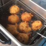 Keer de bollen na enkele minuten om. De totale baktijd hangt af van de temperatuur van de olie en de dikte van de oliebol, dus snijd af en toe een oliebol door om te kijken of hij ook van binnen goed gaar is. Met een kleine ijsschep duurt dat ongeveer 6 tot 7 minuten, met een medium ijsschep ongeveer 7 tot 8 minuten.
