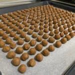 Snij het deeg, met de latjes als liniaal, in reepjes van 1x2cm. Rol elk reepje tot een balletje. Probeer het deeg ondertussen zo weinig mogelijk te kneden, want zo worden de pepernoten mooi bros. Leg de balletjes op bakpapier op een bakplaat. Dicht bij elkaar, want het worden er wel 200 tot 250, maar net niet tegen elkaar want de nootjes rijzen nog in de oven.