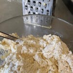 Voeg dan het eimengsel toe en roer het kort met een vork totdat het een geheel wordt. Het lijkt in het begin wat droog, maar het gaat vanzelf plakken. Doe dit niet met de mixer en probeer het ook het niet tot een soepel deeg te kneden; het moet heel los en plakkerig blijven, want dat geeft na het bakken die typische losse structuur aan de Woepies.