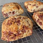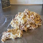 Voeg vervolgens de groffe kaneelsuiker toe en werk dit met een vork door het deeg. Roer ook nu zo kort mogelijk, als was het maar omdat de kaneelsuiker anders uit elkaar kan vallen of zijn kleur kan afgeven aan het deeg. Werk snel, want het deeg moet goed koud blijven, anders smelt de boter voortijdig. Vet een velletje vershoudfolie in en stort daarop het deeg.