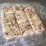 Leg er nog een velletje ingevet vershoudfolie overheen en rol het met een deegroller snel uit tot een vierkant van ongeveer 15cm bij 15cm, dat is ongeveer 2,75cm dik. Snelheid is hier belangrijker dan precisie, want het deeg warmt snel op. Plaats het deeg in folie vervolgens een half uur tot een uur in de vriezer, tot het goed stevig maar niet hard bevroren is.